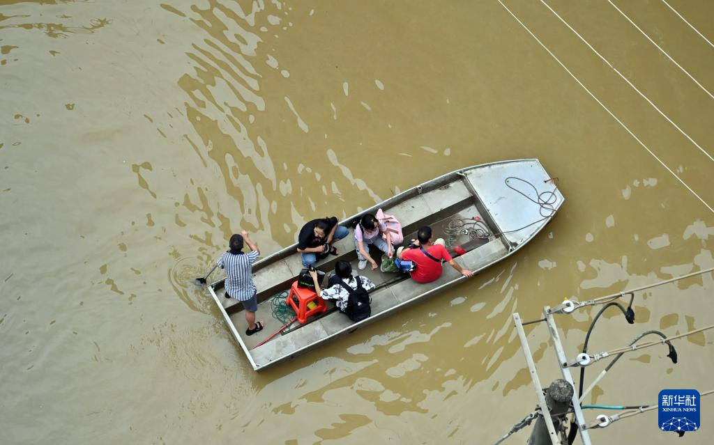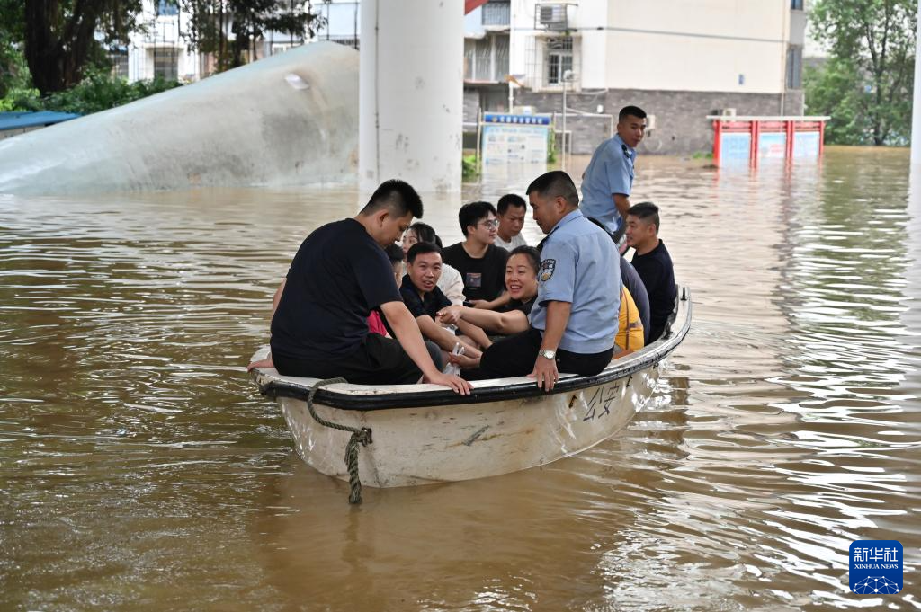 6月18日,在廣西柳州市濱江西路,民警用沖鋒舟接送居民。