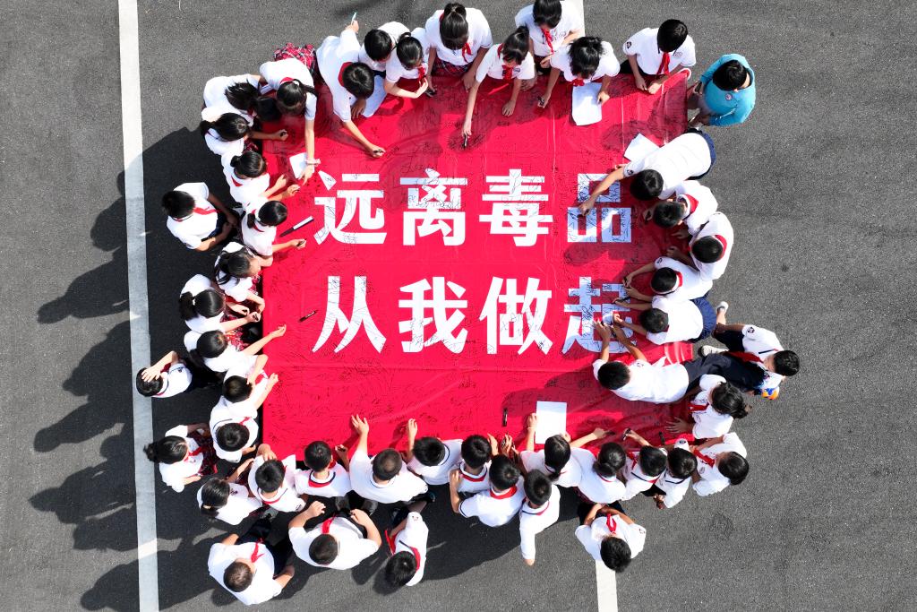 6月21日,廣西興業縣的部分學生在廣西禁毒教育示范基地參加禁毒宣傳活動(無人機照片)。