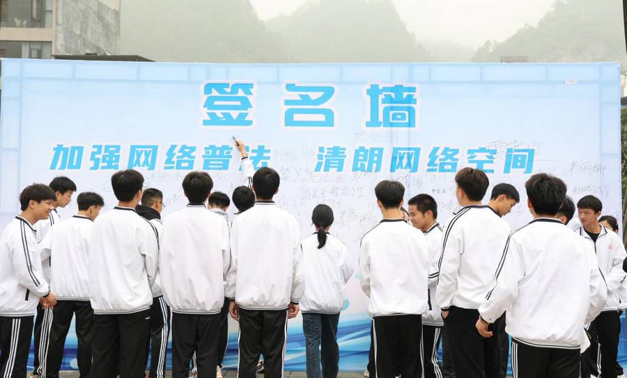 網絡普法啟動儀式上,學生在簽字墻上簽字