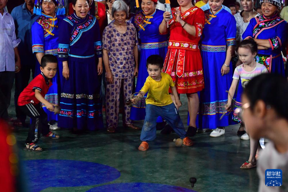 在河池市大化瑤族自治縣大化鎮仁良村,小學生在參加陀螺比賽(2024年5月25日攝)。
