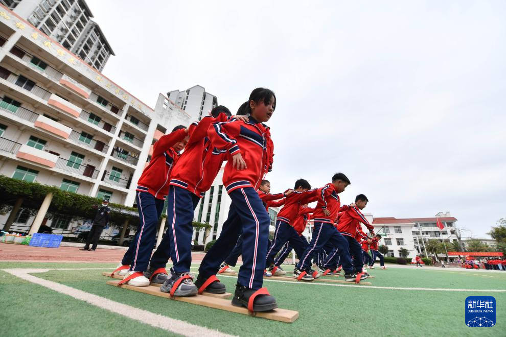 在梧州市長洲區龍平小學,學生們在陽光大課間進行板鞋練習(2024年3月26日攝)。