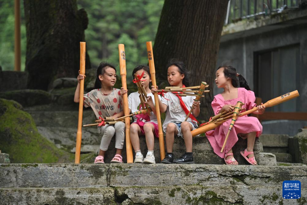 在柳州市融水苗族自治縣桿洞鄉黨鳩村,小學生準備練習吹蘆笙(2024年7月9日攝)。