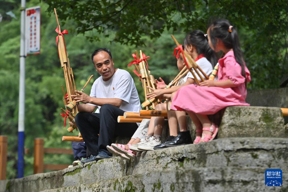在柳州市融水苗族自治縣桿洞鄉黨鳩村,潘先鋒老師在指導小學生練習吹蘆笙(2024年7月9日攝)。