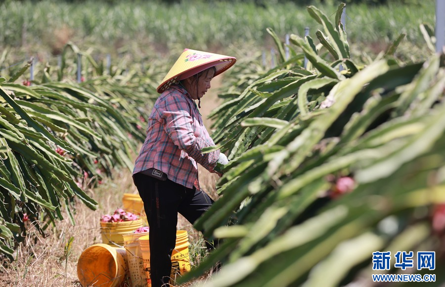 工人在農場采摘成熟的火龍果。