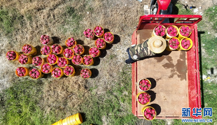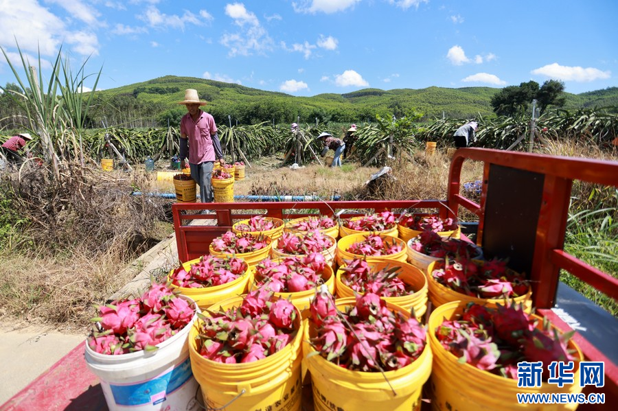工人搬運采摘好的火龍果。