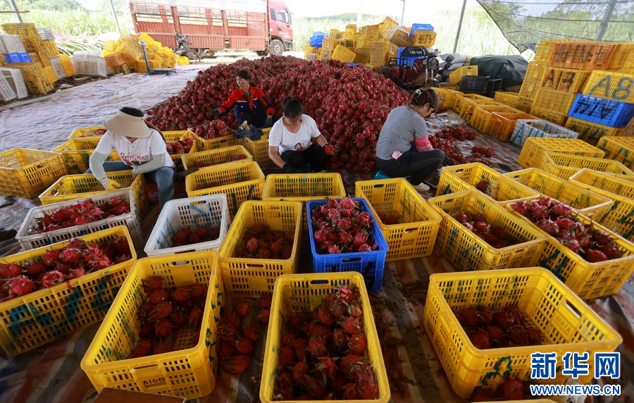 工人將采摘好的火龍果挑出農場。