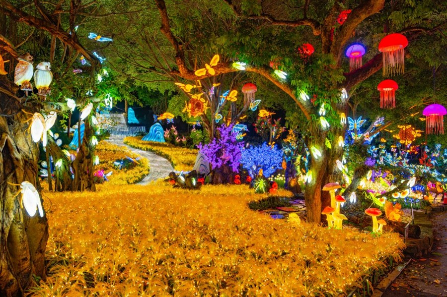 出花園市集,往金杉湖方向走,靠近蘭園一側前行,到達昆蟲世界,大量造型各異、形態生動的“放大版”昆蟲燈光造型,親臨一場仲夏花蟲的視覺盛宴。