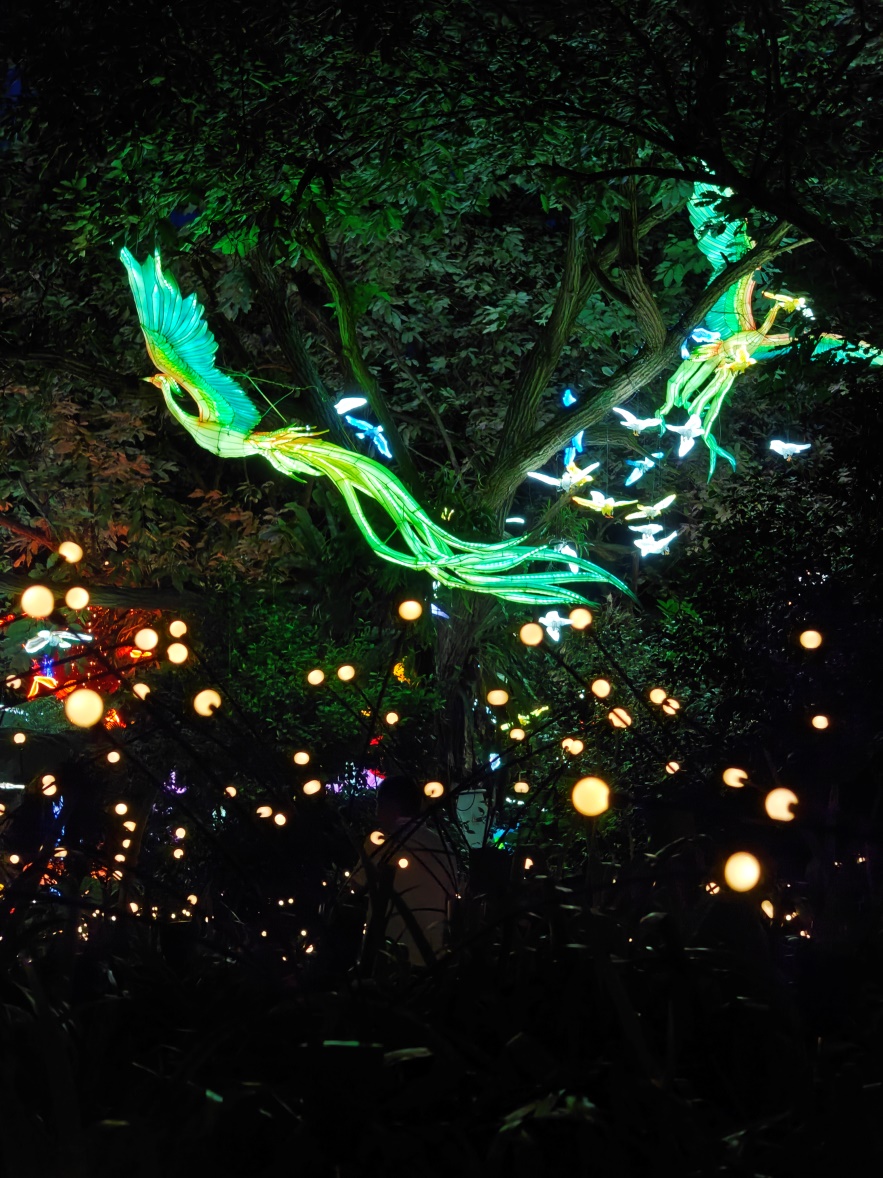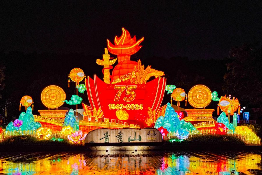 從北門進入,首先打卡75周年的“輝煌禮贊”,感受即將到來的國慶喜悅。在蘭湖邊上,我們還能看到巨大的“雙龍呈祥”和夢幻天鵝燈組。