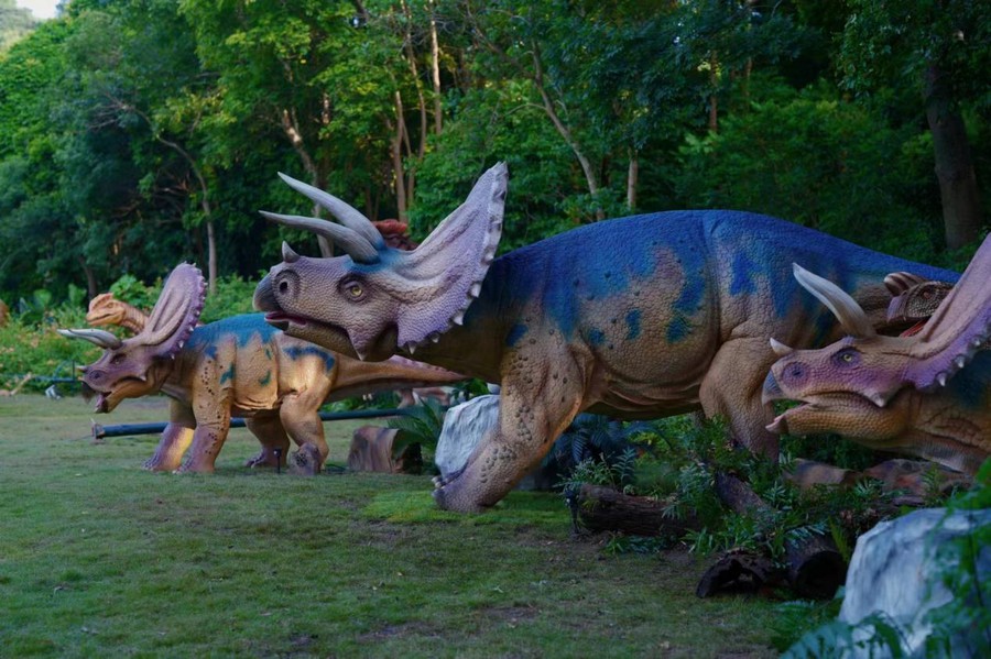 往絢蘭花田方向走100米左右,按照指引,右轉下臺階到達蘭園大草坪,我們就來到了期盼已久的恐龍世界!現場有近60只體形碩大、形態各異、栩栩如生的“恐龍”,仿佛穿越侏羅紀公園!