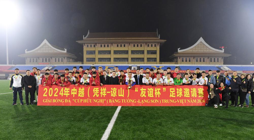 2024年中越(憑祥-諒山)“友誼杯”足球邀請賽,賽后雙方隊員合影。(龐立堅 攝)