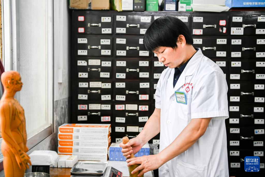 8月15日,在廣西河池市宜州區德勝鎮上坪村衛生室,鄉村醫生葛現克在研磨中藥。