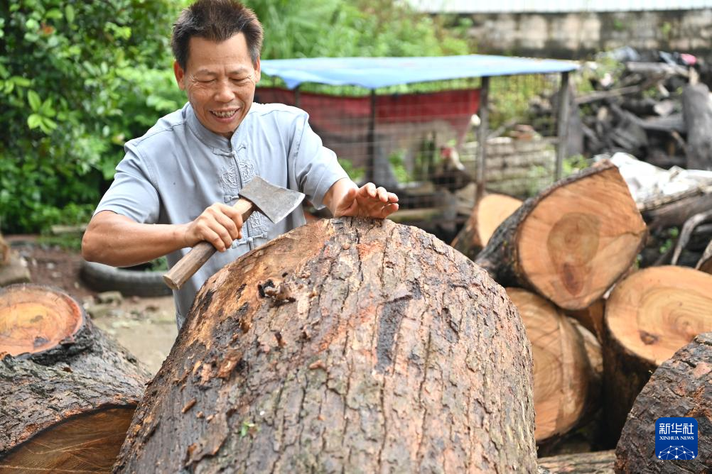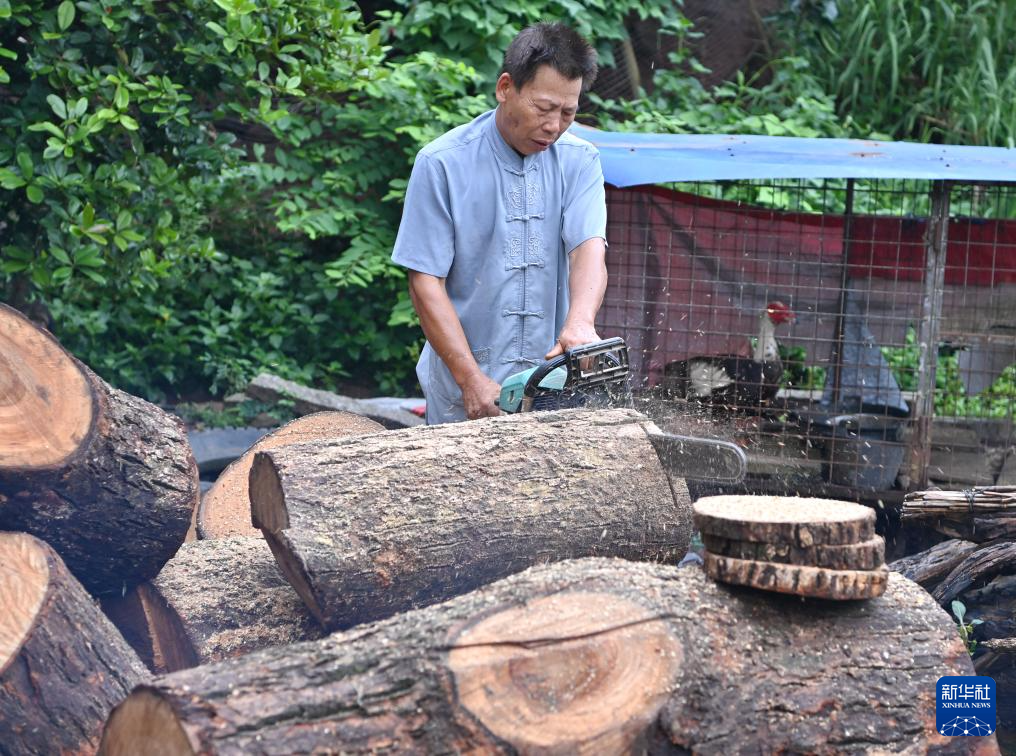 施紹漢在給木頭去皮,準備制作煙墩大鼓(8月15日攝)。