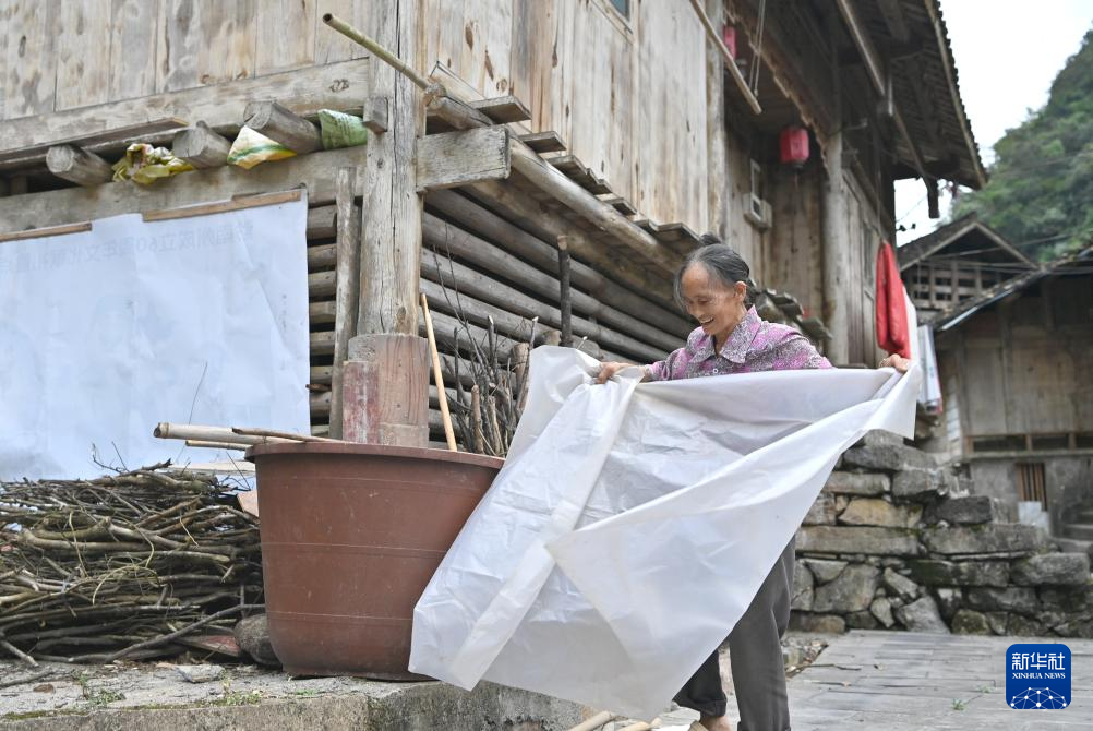 在廣西河池市南丹縣里湖瑤族鄉八雅村巴哈屯,一位村民準備用塑料布蓋裝著玉米的桶(8月28日攝)。