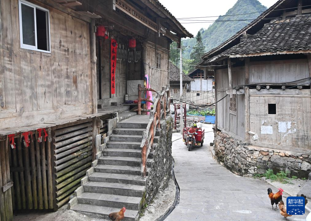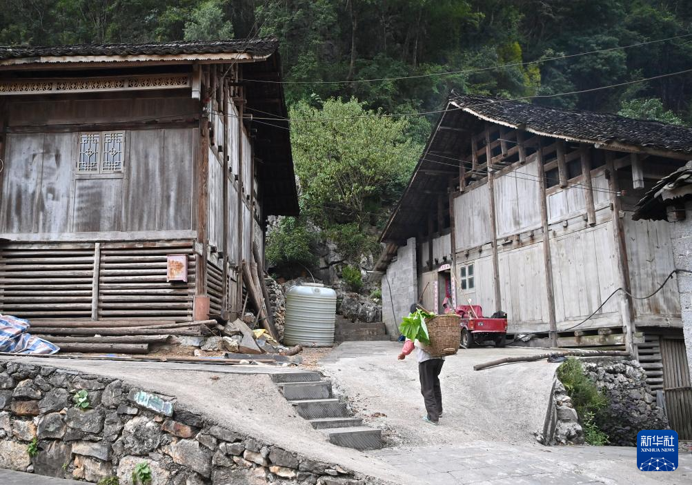 在廣西河池市南丹縣里湖瑤族鄉八雅村巴哈屯,一名村民帶著孩子走出家門(8月28日攝)。