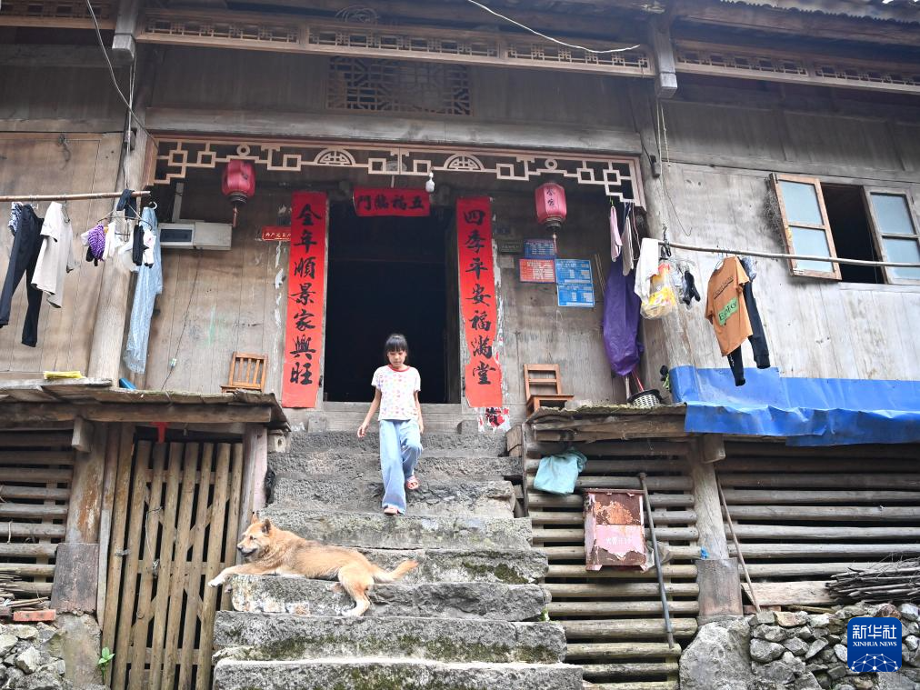 在廣西河池市南丹縣里湖瑤族鄉八雅村巴哈屯,一名孩子走出家門(8月28日攝)。