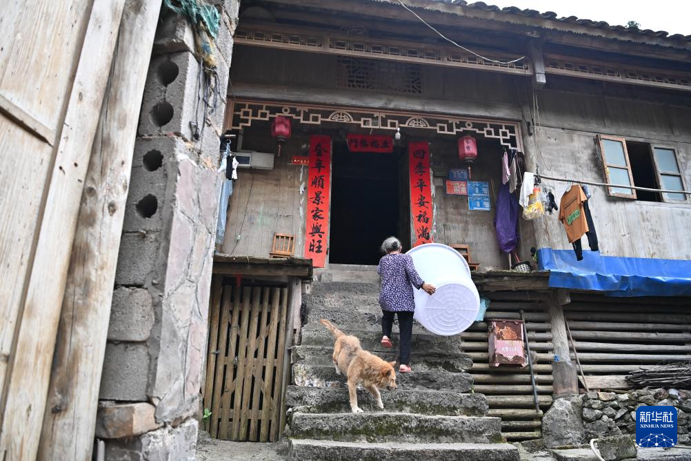在廣西河池市南丹縣里湖瑤族鄉八雅村巴哈屯,村民從存放糧食的二樓下來(8月28日攝)。