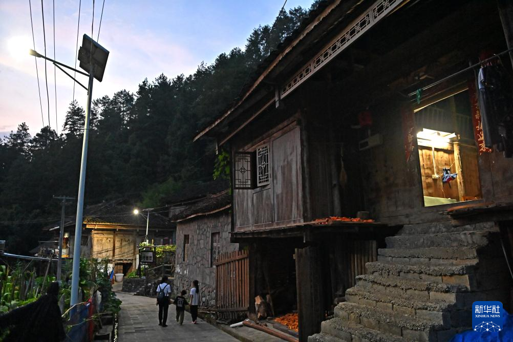 在廣西河池市南丹縣里湖瑤族鄉八雅村巴哈屯,夜晚的燈光為歸家的人們照亮村路(8月28日攝)。