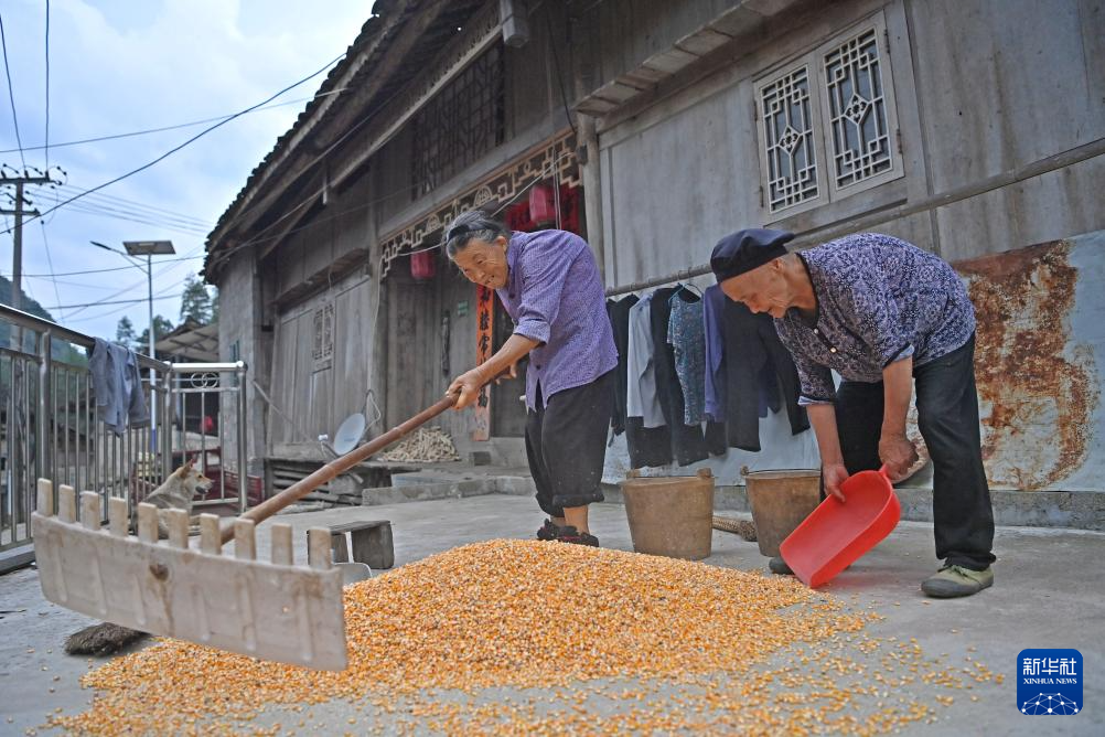 在廣西河池市南丹縣里湖瑤族鄉八雅村巴哈屯,兩位村民在收晾曬在自家門前的玉米(8月28日攝)。