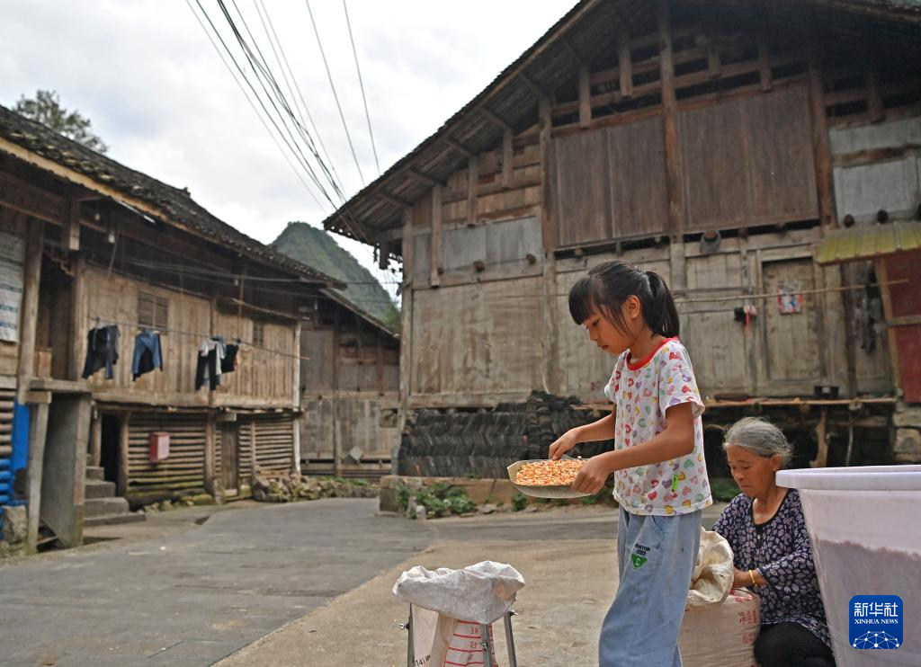 在廣西河池市南丹縣里湖瑤族鄉八雅村巴哈屯,一名孩子在和奶奶一起收玉米(8月28日攝)。