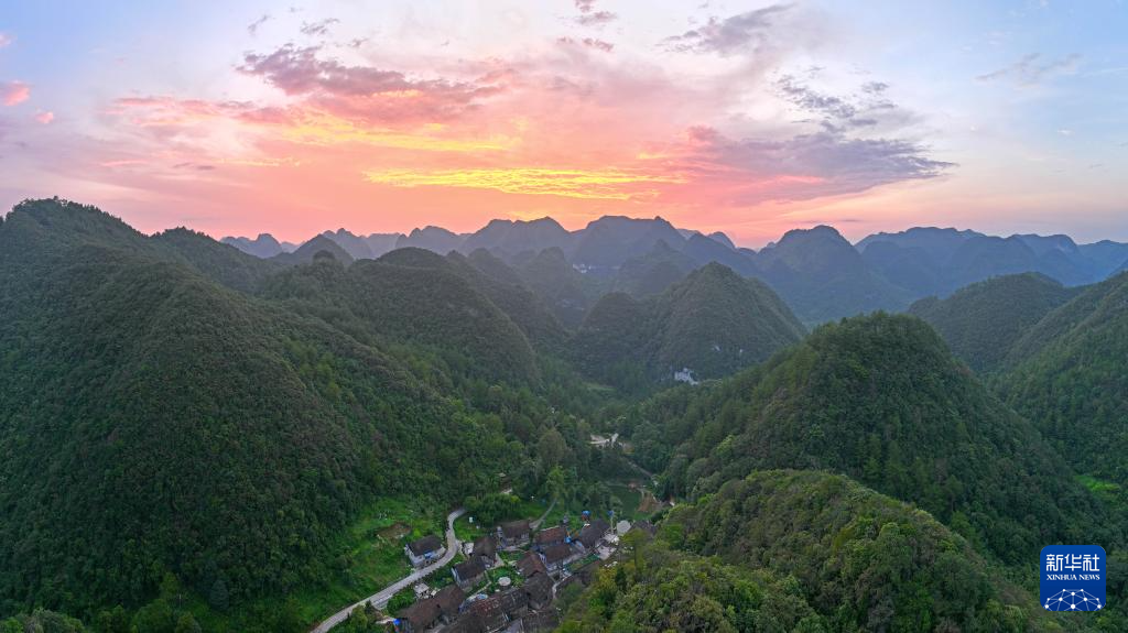 艷麗的晚霞給大山深處的廣西河池市南丹縣里湖瑤族鄉八雅村巴哈屯披上彩衣(8月28日攝,無人機照片)。