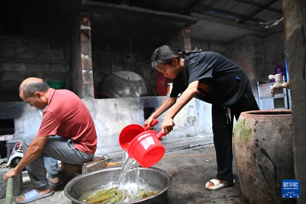 在廣西河池市南丹縣里湖瑤族鄉八雅村巴哈屯,村民岑開伍(左)在鋸竹竿,女兒倒水清洗竹筒,一起為制作糯米飯做準備(8月28日攝)。