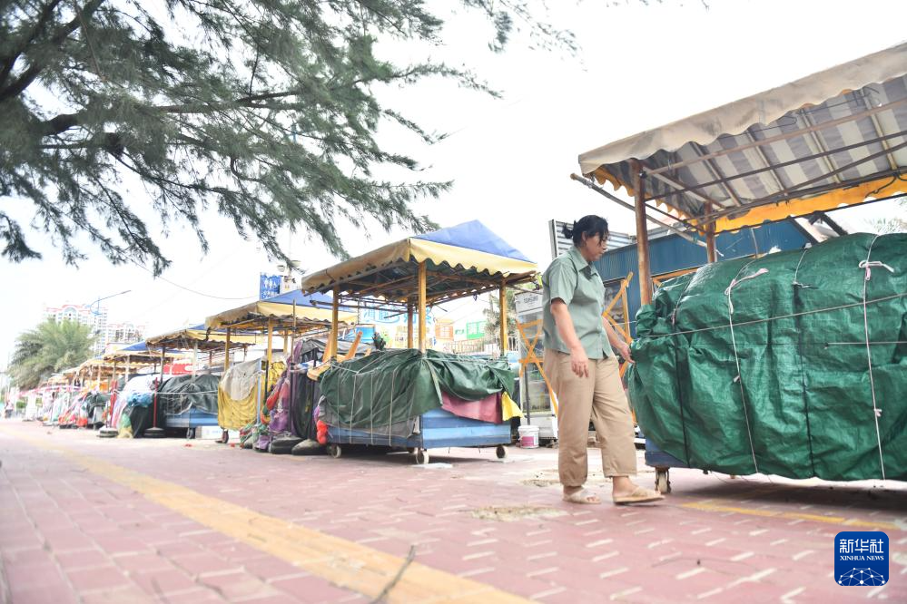 9月6日,在廣西北海市僑港海灘,工作人員在加固旅游設施。