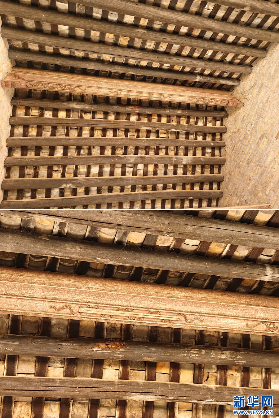 (拼版圖片)東園別墅屋內的主梁中間刻有一雙筷子,又名頂梁筷子,寓意為豐衣足食。