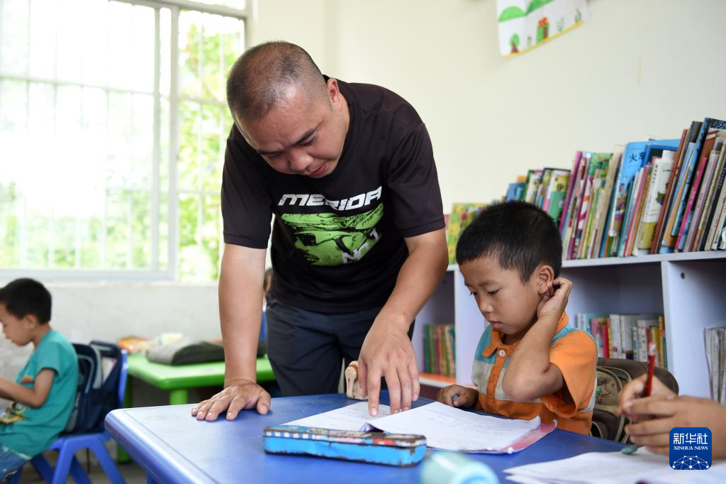在廣西天等縣龍茗鎮東南村煙屯教學點,“80后”老師董祥在輔導學生功課(2015年6月23日攝)。
