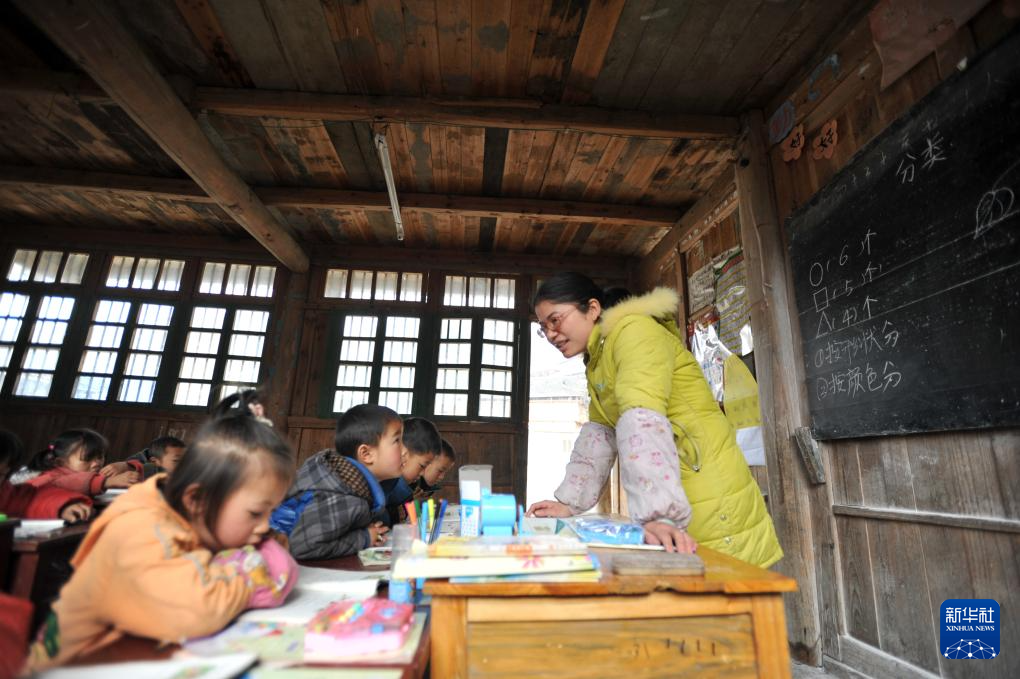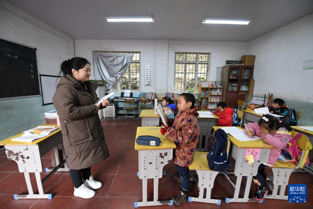 在廣西靈川縣蘭田瑤族鄉東良教學點,“85后”老師石夏月給學生上課(2022年2月24日攝)。