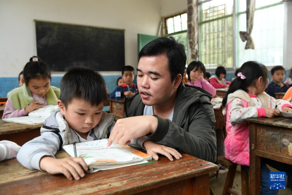 在廣西富川瑤族自治縣新華鄉湖廣小學,“90后”老師謝其鶴在輔導學生功課(2019年3月20日攝)。