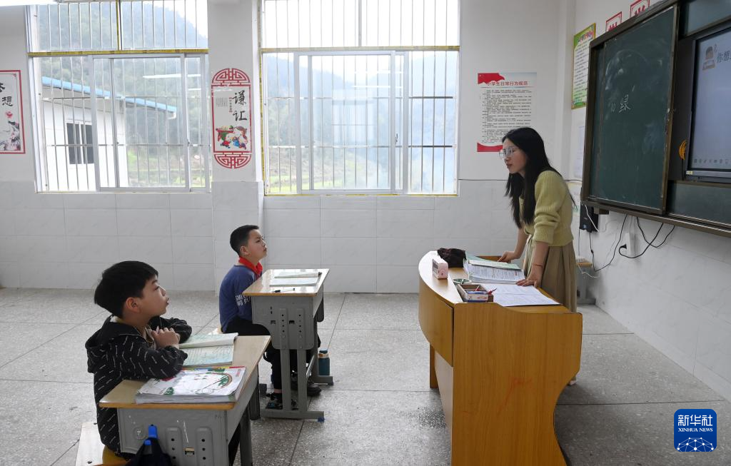 在廣西灌陽縣洞井瑤族鄉野豬殿小學,“95后”老師趙艷在給學生上課(3月27日攝)。