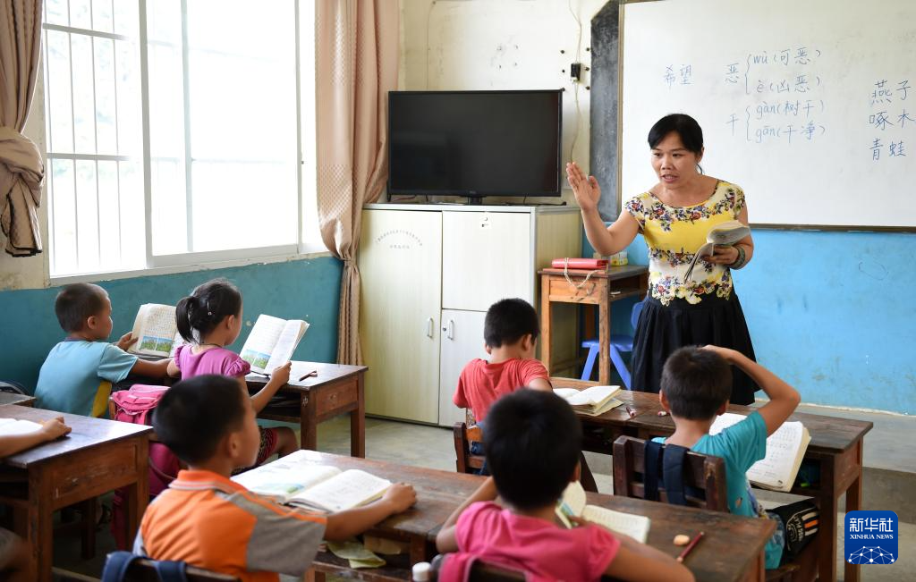 在廣西金秀瑤族自治縣忠良鄉更范教學點,“85后”老師盧秀芬在給學生上課(2019年6月5日攝)。