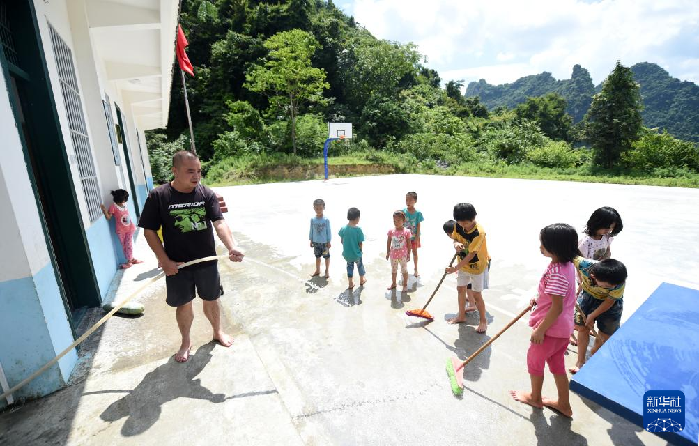 在廣西天等縣龍茗鎮東南村煙屯教學點,“80后”老師董祥在和學生一起做衛生(2015年6月23日攝)。