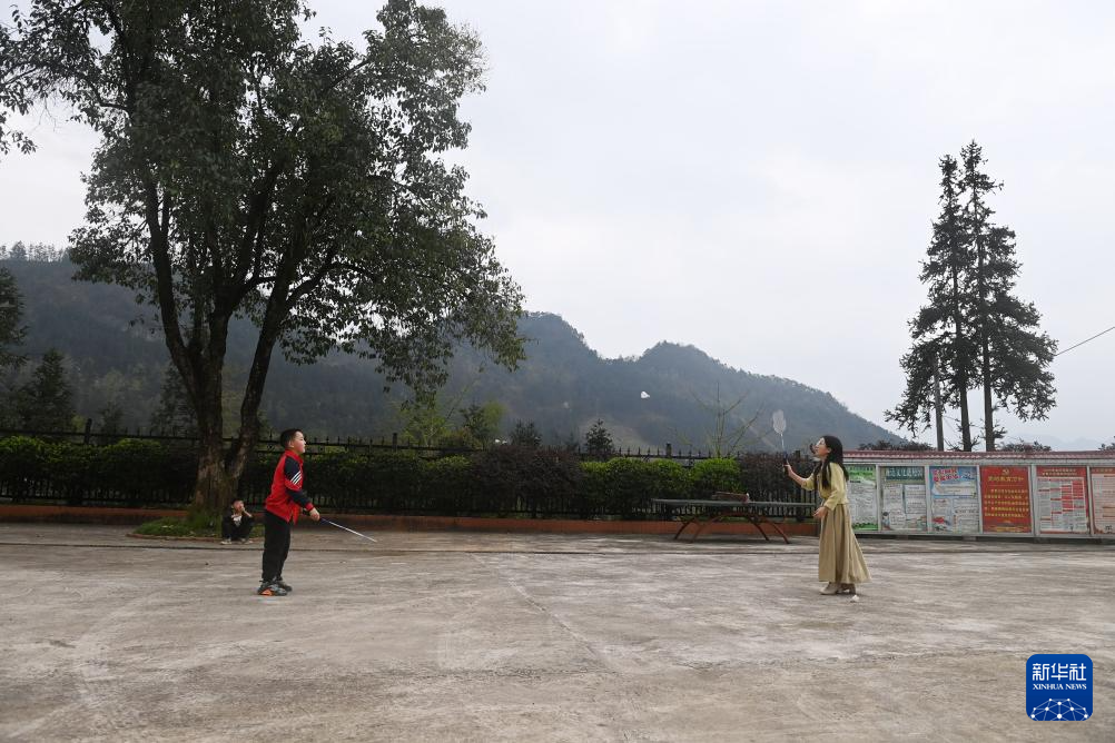 在廣西灌陽縣洞井瑤族鄉野豬殿小學,“95后”老師趙艷和學生打羽毛球(2024年3月27日攝)。