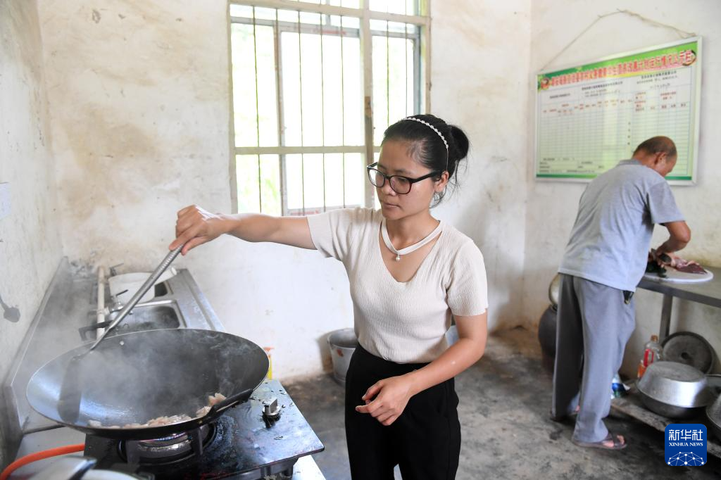 在廣西都安瑤族自治縣龍灣鄉琴棋小學,“85后”老師藍巧春(左)在給學生做午飯(2017年8月31日攝)。