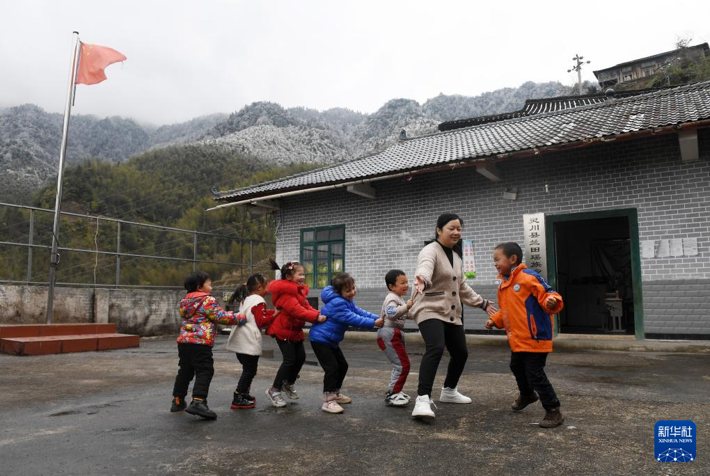 在廣西靈川縣蘭田瑤族鄉東良教學點,“85后”老師石夏月和學生做游戲(2022年2月24日攝)。