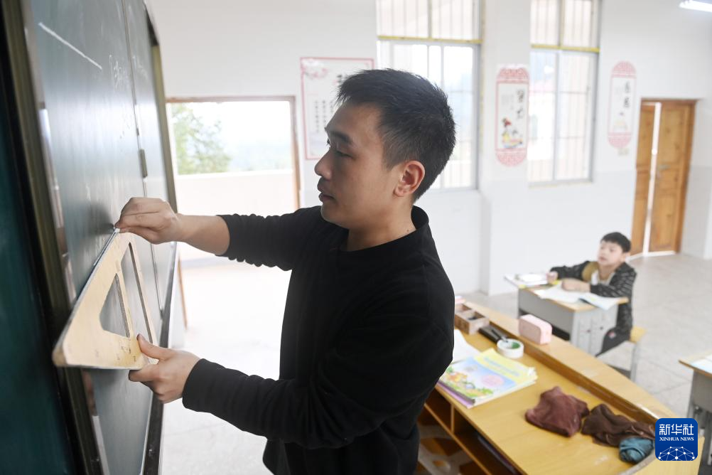 在廣西灌陽縣洞井瑤族鄉野豬殿小學,“85后”老師李清東在給學生上課(2024年3月27日攝)。