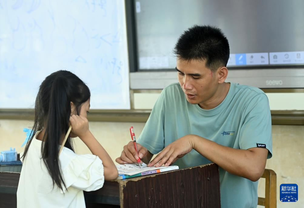 在廣西南寧市邕寧區中和鎮中心學校周祿教學點,“90后”老師何海香指導學生完成課堂作業(2024年9月4日攝)。