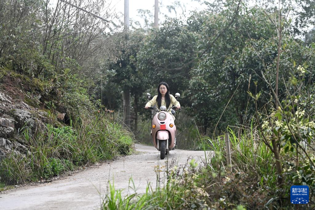 在廣西灌陽縣洞井瑤族鄉野豬殿村,“95后”老師趙艷騎著電動自行車從學?;丶遥?月27日攝)。