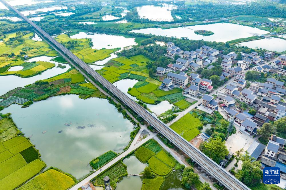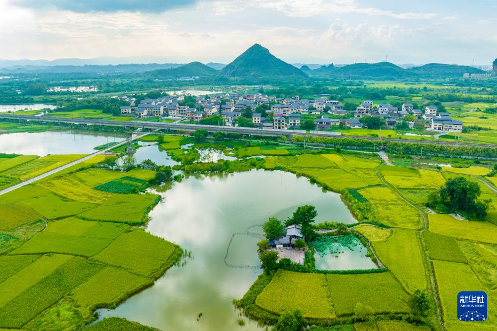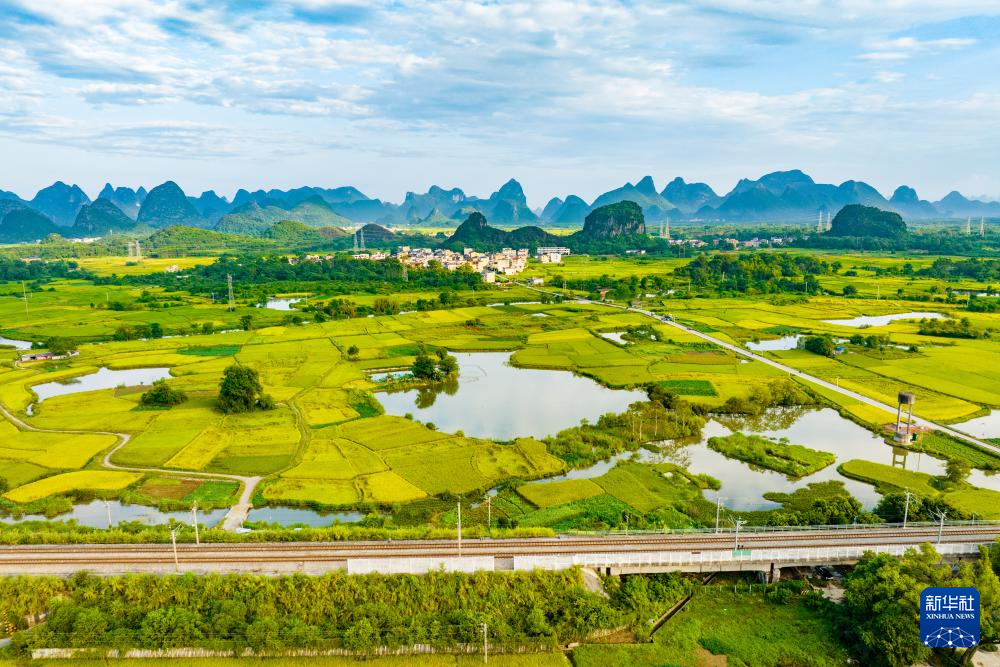 2024年9月16日,在廣西桂林市臨桂區四塘鎮太平村,濕地、田園、村莊、鐵路、晚霞相映成趣,一幅秀美的鄉村秋色畫卷展現在眼前。近年來,當地持續推進農村環境綜合整治,大力發展農村經濟,農村處處呈現出產業興、鄉村美的新畫卷。