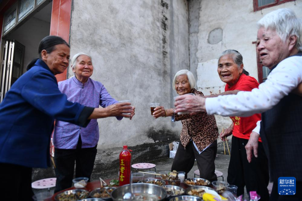 10月6日,在柳州市柳江區三都鎮白見村,老人們在重陽節百家宴中共同舉杯。
