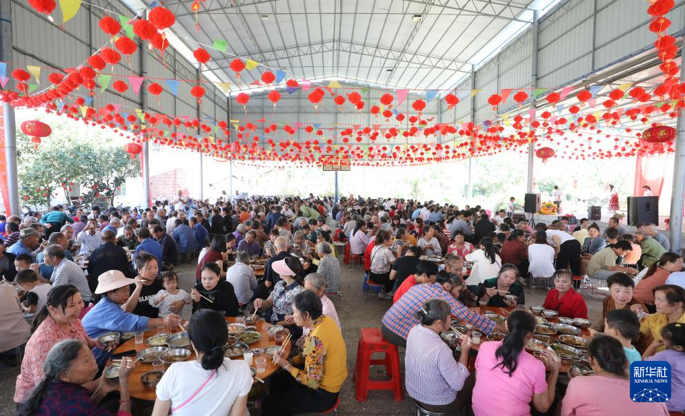 10月5日,在柳州市柳江區成團鎮甘塘村,人們參加重陽節百家宴。
