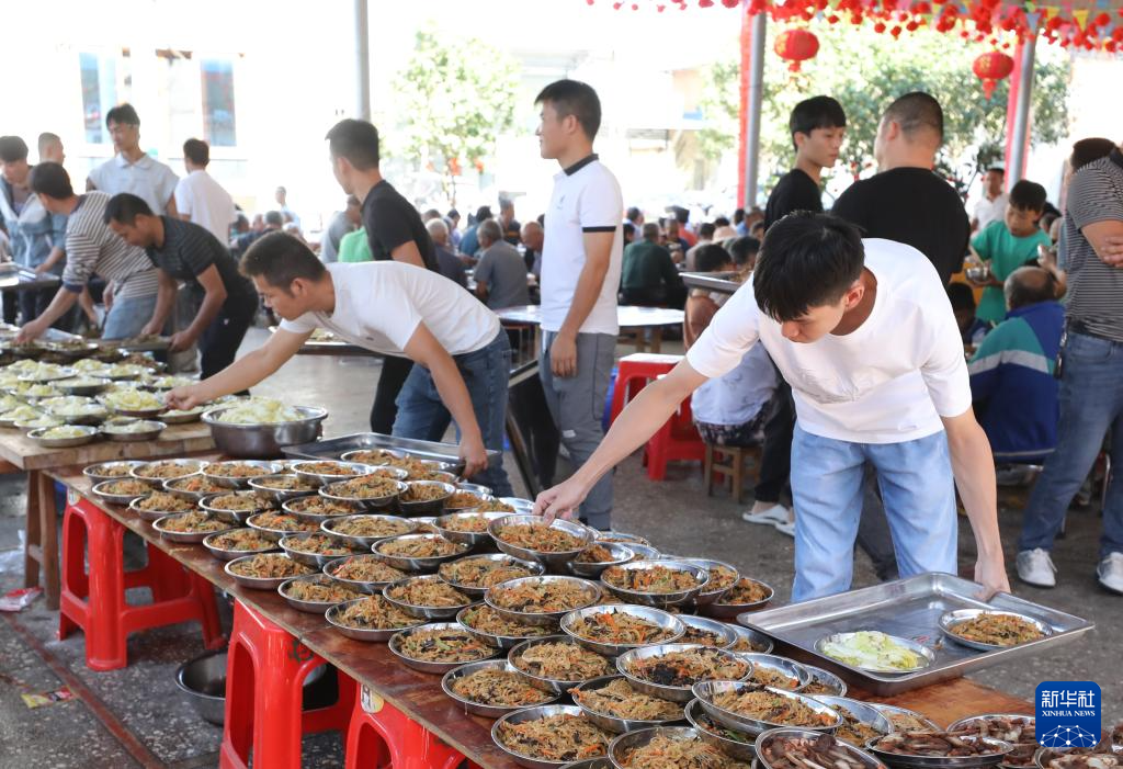 10月5日,在柳州市柳江區成團鎮甘塘村,人們在準備重陽節百家宴。