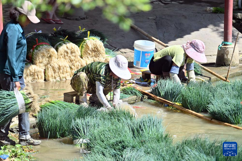 在柳州市柳江區三都鎮覺山村,村民在清洗香蔥(10月6日攝)。
