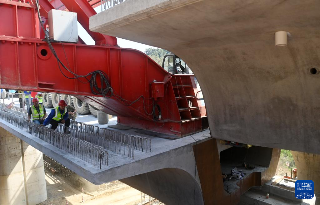 10月11日,在南憑高鐵憑祥東站出站五線大橋上,中鐵一局工人在施工鋪架箱梁。
