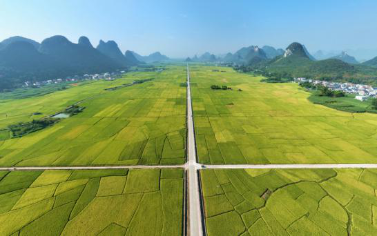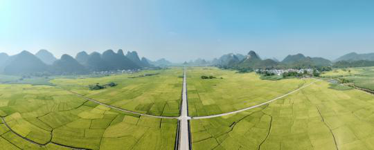 10月12日,在廣西柳州市柳城縣古砦仫佬族鄉,成片的稻谷即將迎來豐收,稻田與村莊、道路、山巒構成一幅秀麗的田園畫卷。
