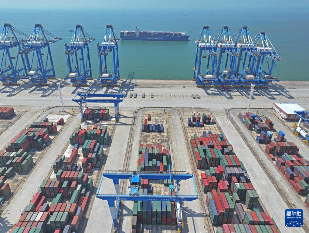 這是10月13日拍攝的廣西北部灣港欽州港區碼頭繁忙景象(無人機照片)。