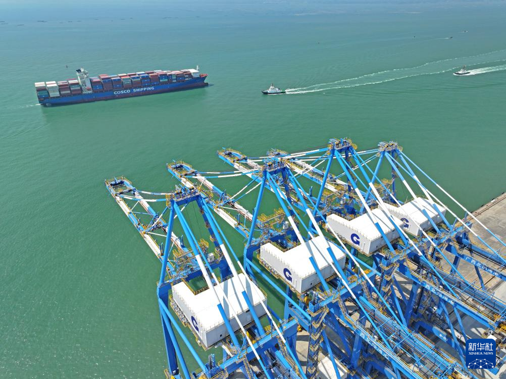 10月13日,一艘集裝箱貨輪在廣西北部灣港欽州港區碼頭靠泊(無人機照片)。