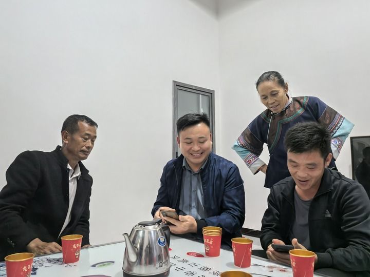 在村民田學軍(左一)家中,農前朝(左二)和村民查看手機中的咖啡樹照片。新華每日電訊記者 徐海濤 攝