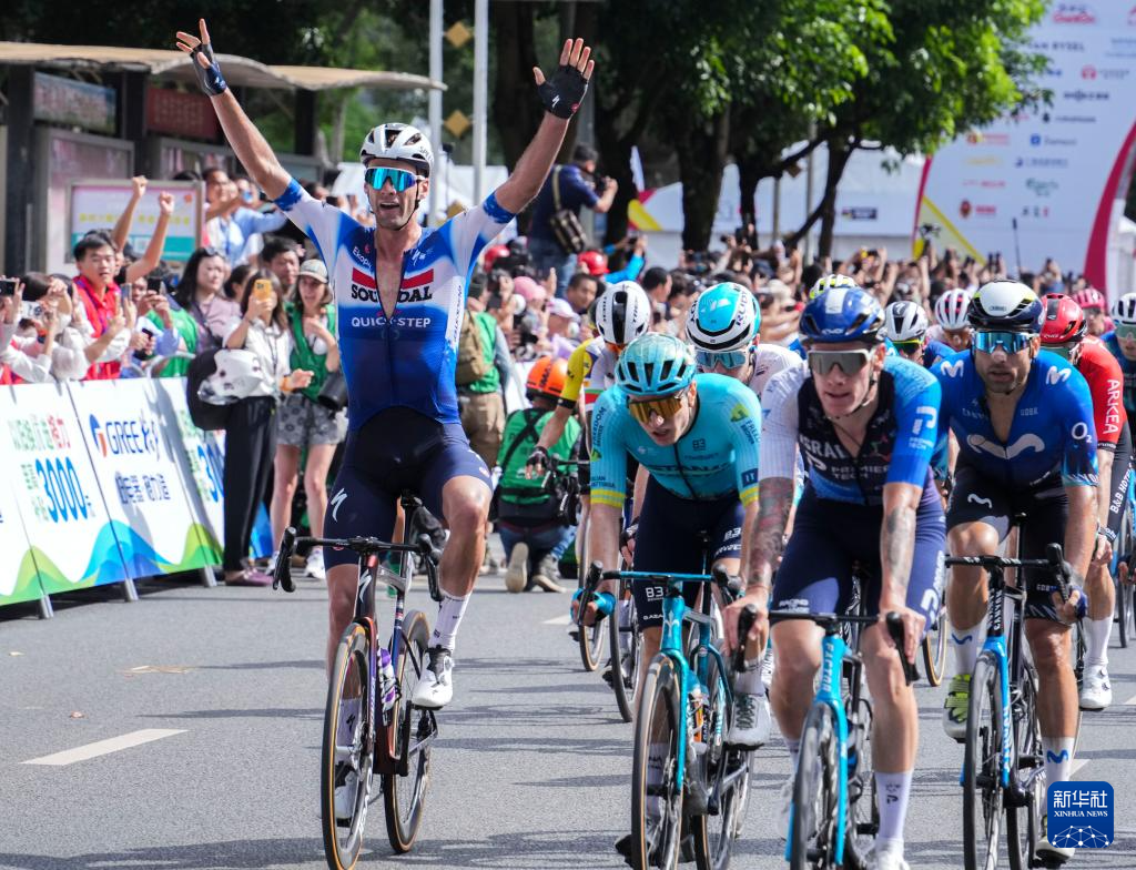 10月16日,速的奧快步車隊的比利時車手瓦爾·范格魯威(左一)在沖線后慶祝。新華社記者 金皓原 攝